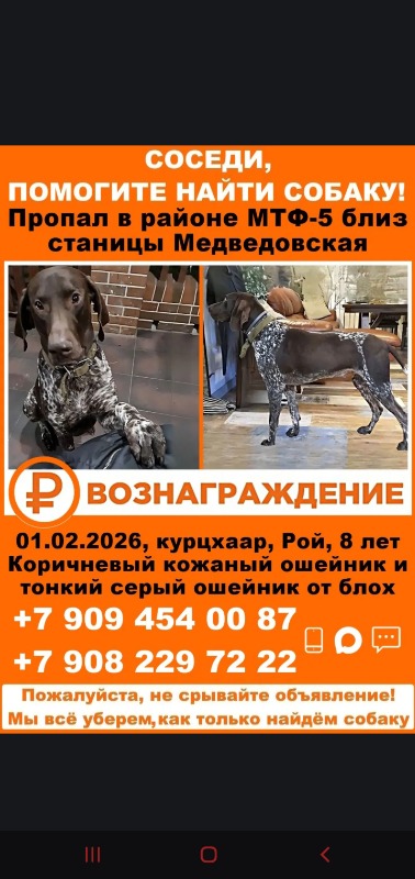 В Ростове-на-Дону, в районе Элеватора, Заречная найдена собака - мальчик, порода курцхаар, молодой 1,5-2 года, окрас коричневый с белой проседью. Хозяин найдись! Пес находится на передержке на заводе....