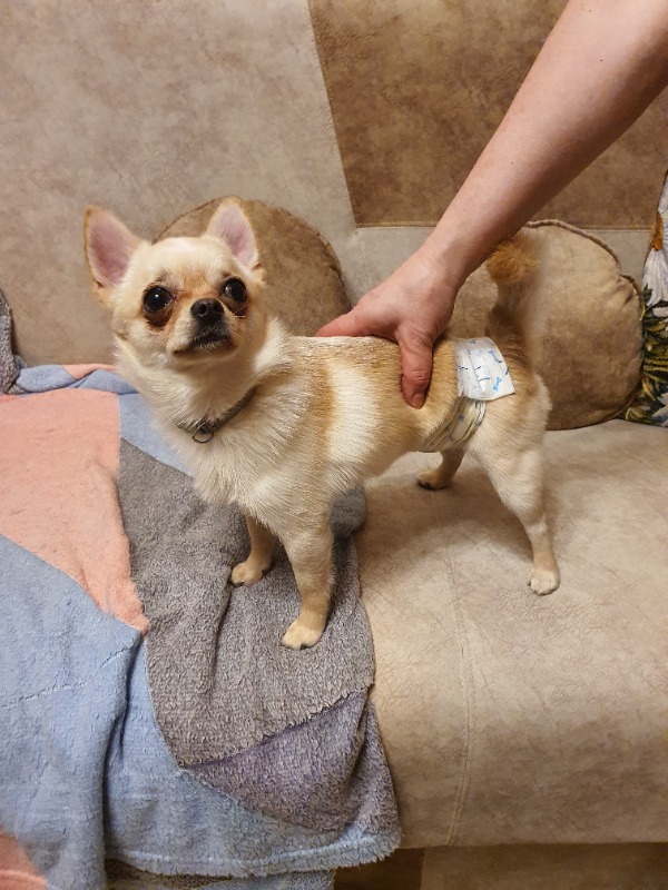 Найдена собака, порода чи-хуа-хуа, кобель, палевый; с ошейником, повязкой на животе. Найлена на ул С. Середы, в районе дома 23/27 и 21; бегал по дороге.