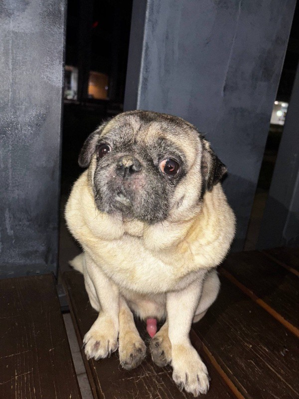 Мопс, окраска белая, упитанный. Хозяева отзовитесь!!!