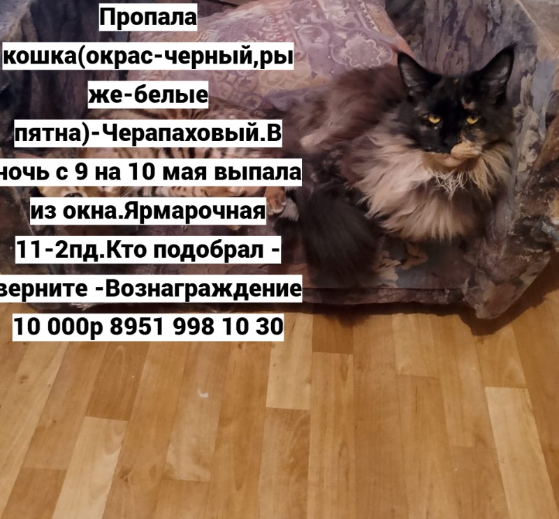 Ярмарочная 11-2пд выпала из окна.Окрас черепаховый (черный,рыжий,есть белые пятна) Вознаграждение. 8 951 998 10 30 Костя