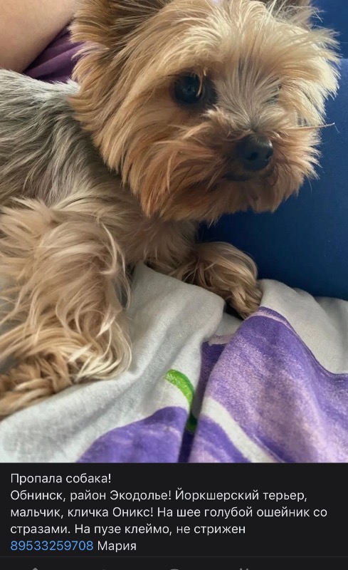Пропала собака. 15.04.2025 убежал из района Экодолье. Йоркшерский терьер мини, мальчик. 89106012014 Светлана