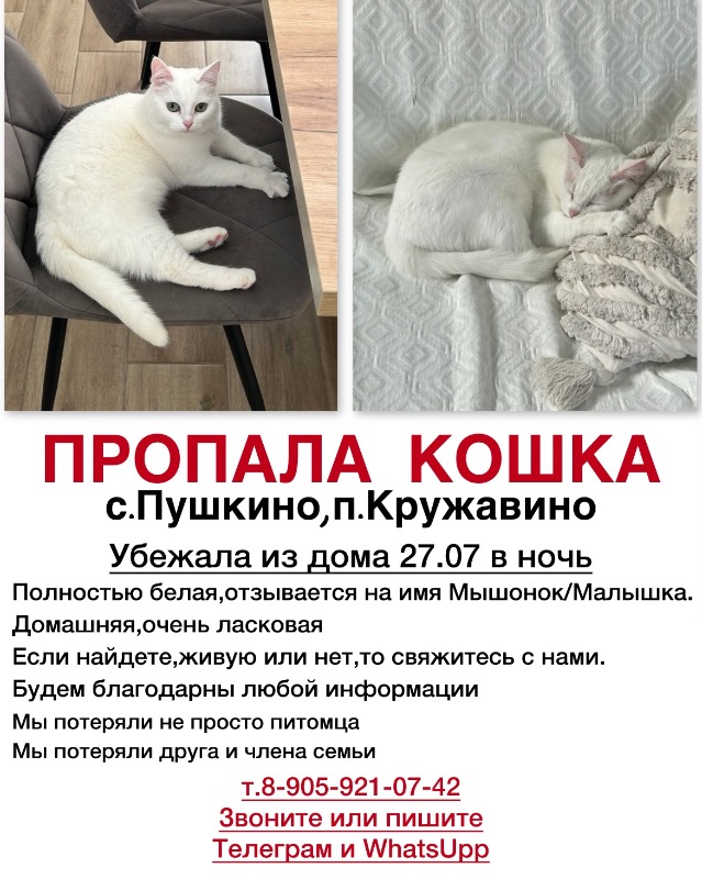 Доброго времени суток Очень нужна помощь в поиске ПРОПАЛА БЕЛАЯ КОШКА Пропала 27.07 .с.Пушкино,п.Кружавино(может находиться поблизости :Кружавино,Пушкино,Пушкин-клаб,Подгородка) Девочка,порода Евр...