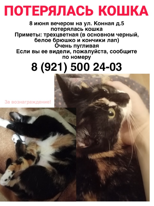 Пропала кошка 8 июня Псков ул. Конная д. 5. Трехцветная, с белым брюшком и белыми кончиками лапок. Очень пугливая Если увидите ее, пожалуйста, напишите или позвоните по номеру 8 (921) 500-24-03