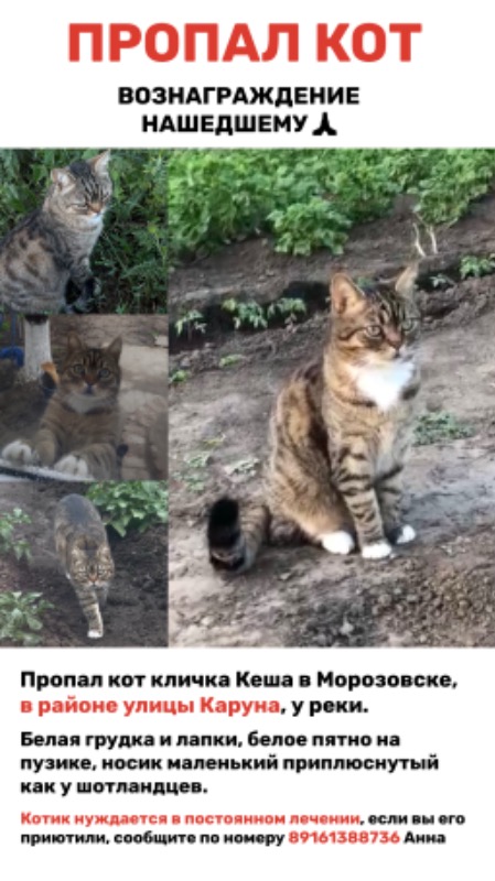 Помогите найти кота за вознаграждение! Пропал котик, кличка Кеша в Морозовске, в районе улицы Каруна, недалеко от реки. Белая грудка и лапки, белое пятно на пузике, носик маленький приплюснуты...