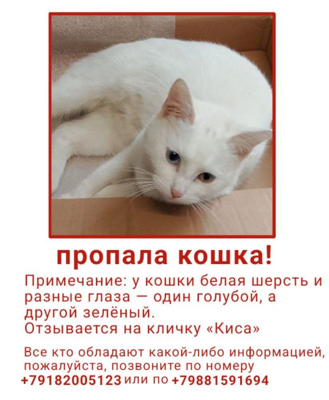 Пропала кошечка 1.5 года ,белая с разными глазами, зовут Киса