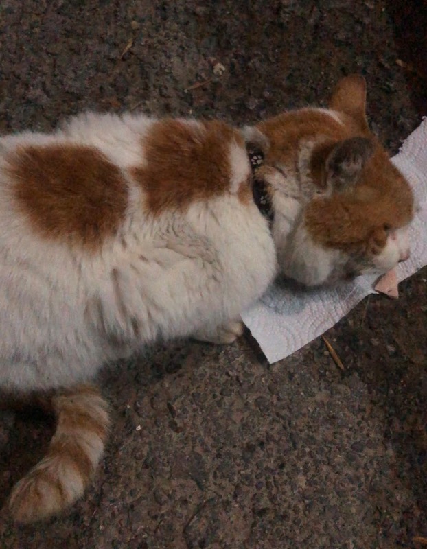 Кот или кошка. Г.Сызрань., улица лазо 21а., 5 подъезд. Белый с рыжими пятнами. Ласковый и ухоженный. С черным ошейником (на ошейнике белые лапки). Отзовитесь.