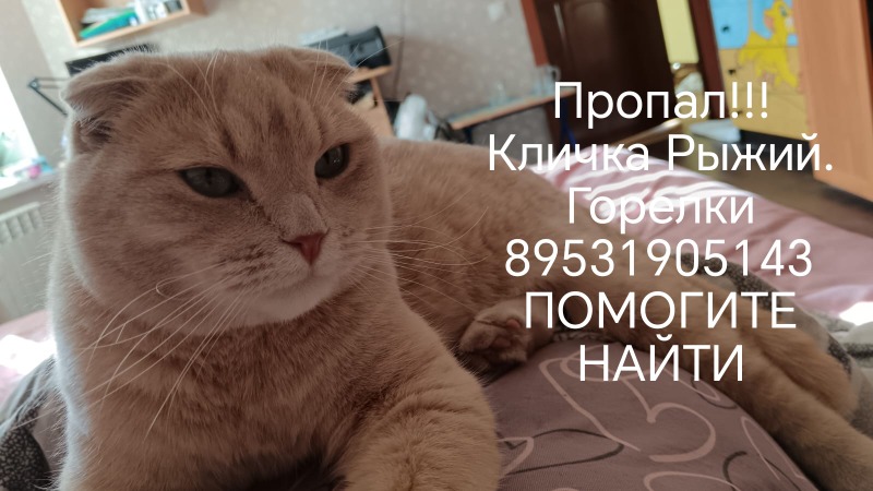 Здравствуйте! 8 апреля в п. Ленинский ул. Центральная пропал кот (район магазина Стройматериалы). Вислоухий, рыжий, рыжие глаза, плюшевая шерсть, кастрированный, без ошейника. Посторонних может поб...
