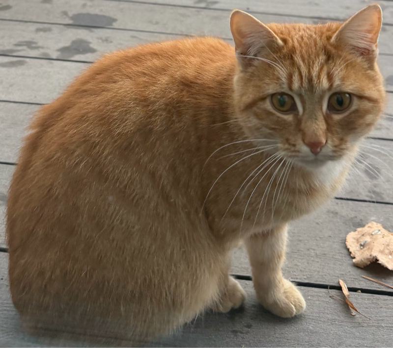 Рыженький, толстенький кот, ласковый, но пугливый, выбежал из подъезда , испугался собаку
