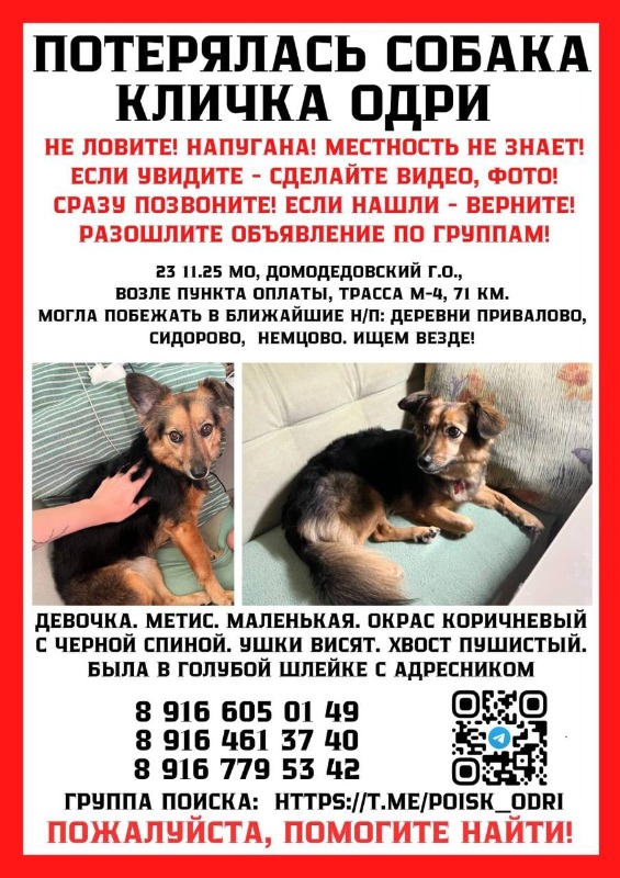 🆘На трассе М-4 Пропала собака 🚨23.11. В 16:37 замечена по камерам на АЗС Роснефть 📍Трасса М-4, 71 км, МО, Домодедовский г.о., Немцово возле пункта оплаты на Москву 23.11.2025 🔎Чат поиска: t....
