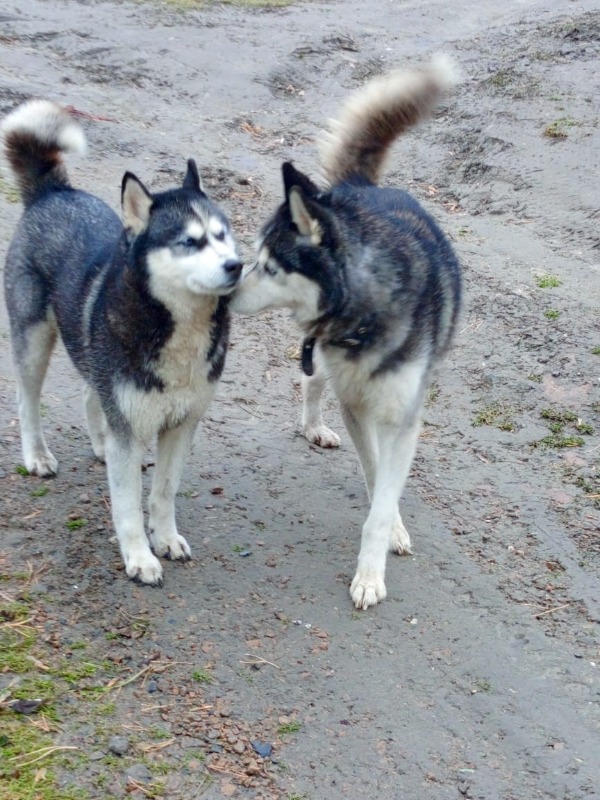 На дачах за мжк Ветеран 4, 6 бегают кобель и сука хаски голодные.