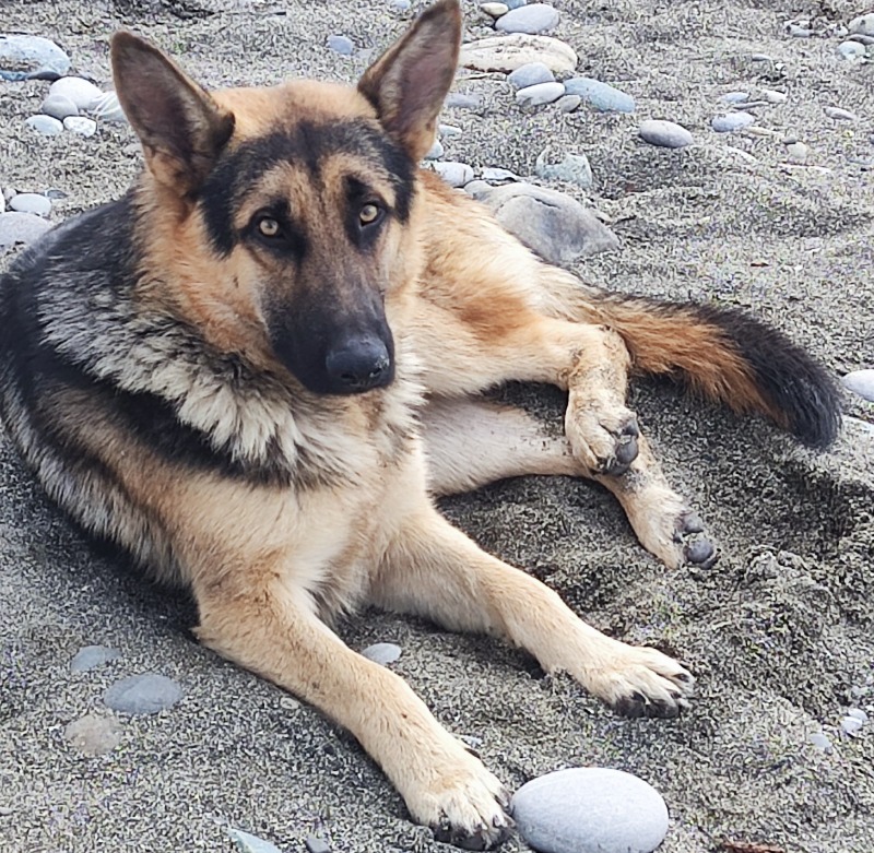 Молодой кобель немецкой овчарки живёт на пляже санатория в Лоо. Появился недавно, был в стрессе. Не агрессивный, играет с песком, тянется к детям