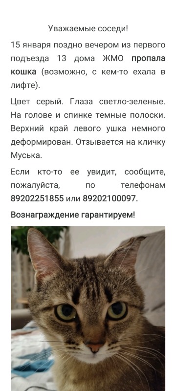 14.01.26 пропал кот. сбежал с вет.лечебницы в 3 микрорайоне опубликуйте ещё раз может кто то увидет его помогите найти 89228748832