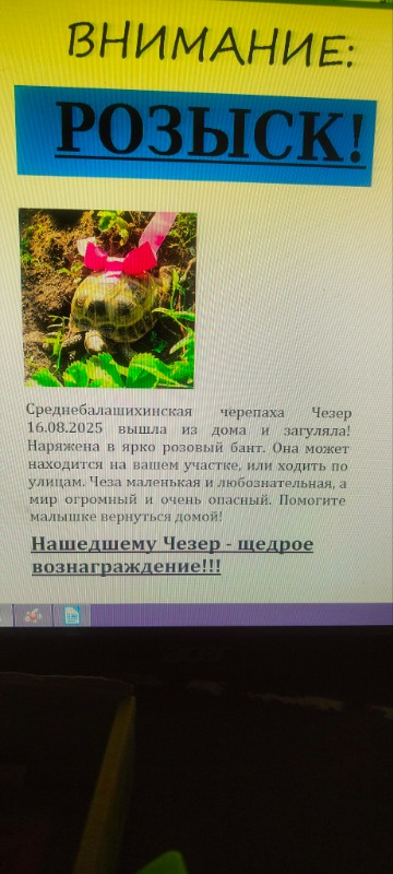 У нас в Рождествено ушла сухопутная большая черепаха. Нижняя часть челюсти смещена. Панцирь с желтоватыми пятнами на светло- коричнево- фоне. Вознаграждение гарантировано 40000 рублей. Возможна ещё ...
