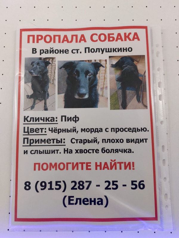 Чёрный беспородный пёс по кличке Пиф. Взрослый, глуховат и подслеповат, подозрительный, но не агрессивный. Без ошейника и поводка. Убежал в лес и не вернулся в районе ж/д станции Полушкино смоленского направления РЖД (Одинцовский округ МО)