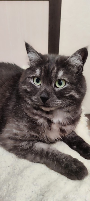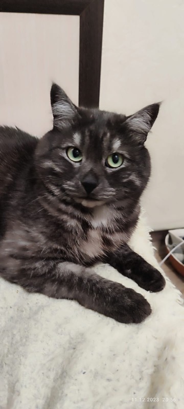 Окрас серо-черный с белым подшерстком. Домашний,на улицу не выходит,пугливый.Вышел в подъезд и исчез. Кастрированный,страдает мочекаменной болезнью,питается лечебным кормом.