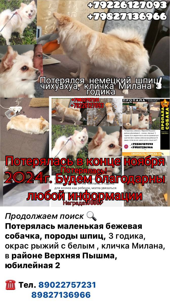 Продолжаем поиск 🔍 Потерялась маленькая бежевая собачка, породы шпиц, 3 годика, окрас рыжий с белым , кличка Милана. Сказали что видели с маленькой девочкой в том же районе, и есть вероятность что ...