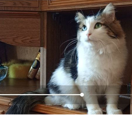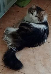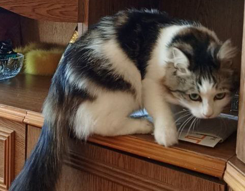 Приметы: цвет пестрый (белое пузо, черно-бело-рыжая спина), пушистый хвост