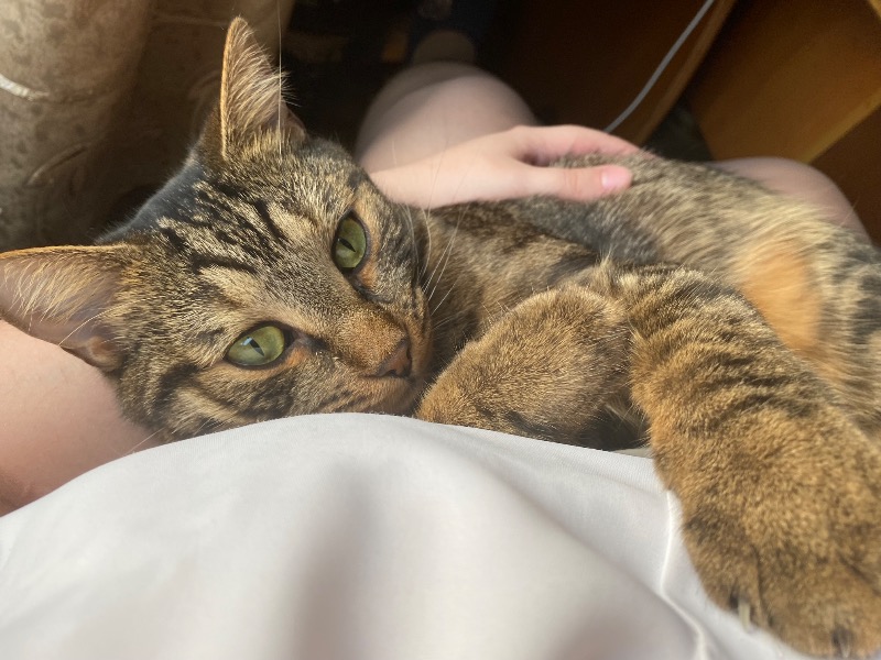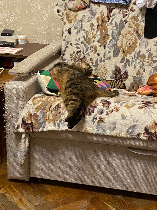 Особые приметы: стройный кот; на верхнем нёбе есть пятнышко; на животе в районе грудиной клетке есть шерсть немного покороче, так как сбривали в ветклинике (еще не успела до конца отрасти). Хвост с ярко выраженными кольцами и черной кисточкой на конце. Очень ласковый, но трусливый и пугливый. Был без ошейника.