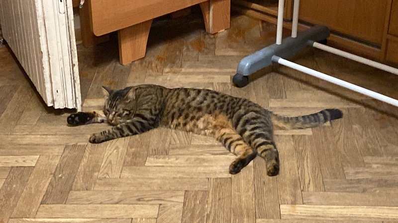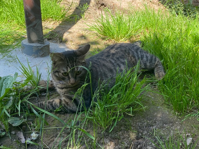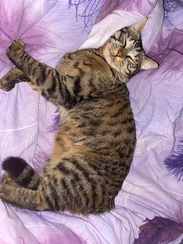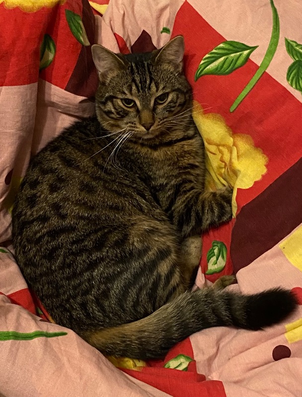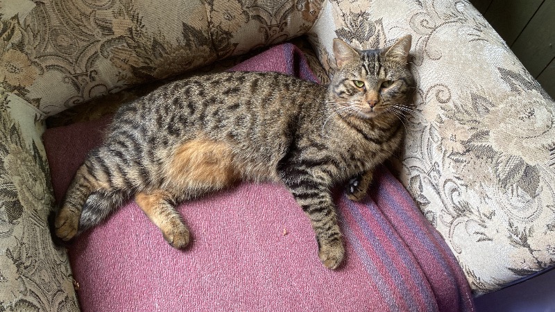 Окрас: Коричнево-серый тигровый (табби) с чёткими тёмными полосами.