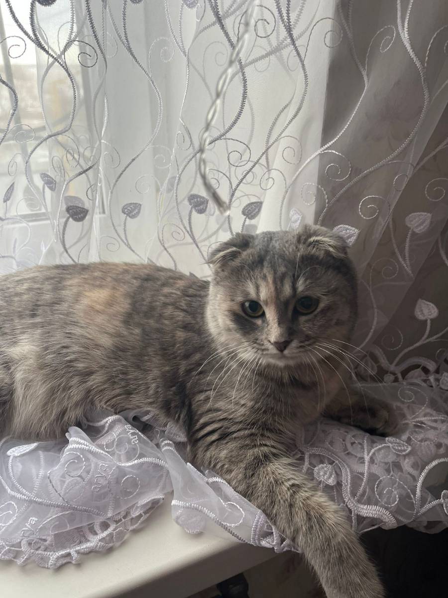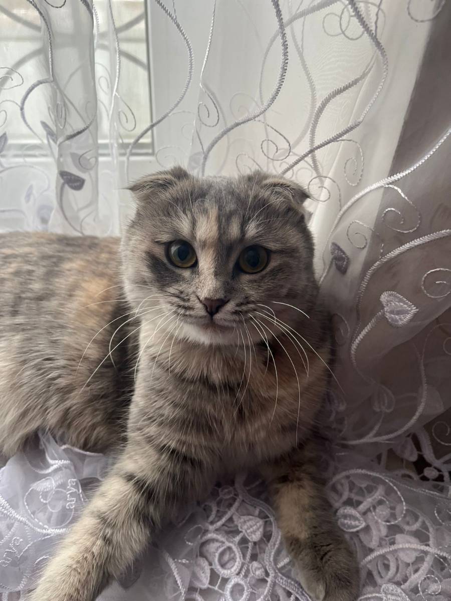 серая, шотландская вислоухая, ошейник с колокольчиком
