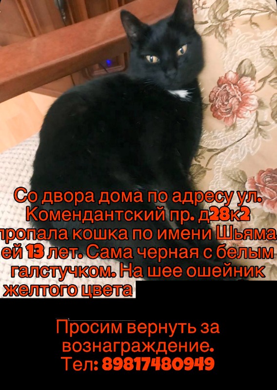 Потерялась кошка с ярко-жёлтым ошейником, ласковая, не боится людей, улизнула в окно первого этажа 30.05.2025 Комендантский пр. 28 к 2 Нашедшему вознаграждение!!!!