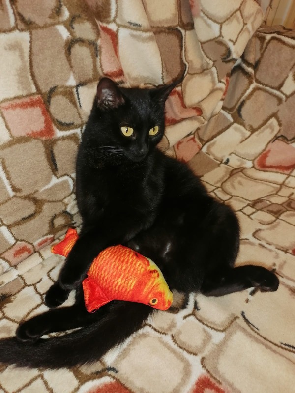 Полностью черная, без породы. Глаза ярко-желтые, кошечка небольшая, с холеной мягкой шерстью. Около четырех лет.