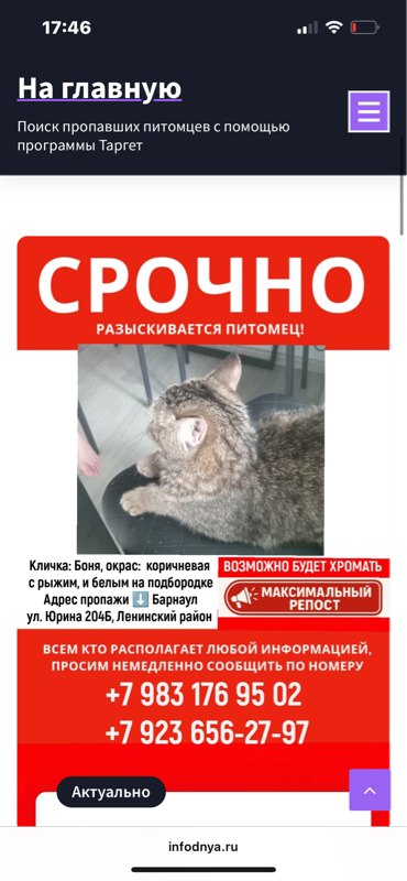 Потерялась кошечка помогите найти все 4 дня плачу кличка: Боня, порода: такая коричневая с рыжим, и белым на подбородке, адрес: город Барнаул, улица Юрина 204Б, Ленинский район, номер: +7 983 176 95 02, или +7 923 656-27-97
