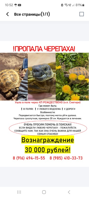 У нас в Рождествено ушла сухопутная большая черепаха. Нижняя часть челюсти смещена. Панцирь с желтоватыми пятнами на светло- коричнево- фоне. Вознаграждение гарантировано 40000 рублей. Возможна ещё премия. Отзовитесь кто нашёл. Николай, Эльвира Это Наш очень дорогой сердцу член семьи! Пожалуйста помогите 8 916 169 25 49