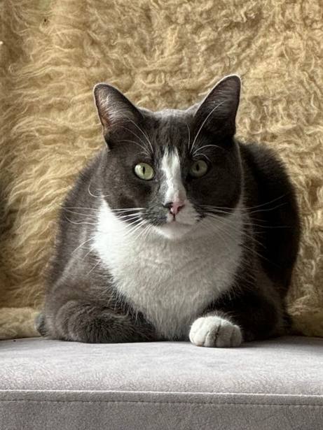 Окрас серый, белый нос и грудка, белые лапки, откликается на кличку Вата.