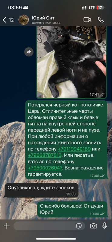 В СНТ Кировец -1, около Жк Трилогия на Ополчения 149 05.09.2025 Потерялся черный кот по кличке Царь. Отличительные черты обломан правый клык и белые пятна на внутренней стороне передней левой ноги и на пузе. Белые волосы внутри ушей.При любой информации о нахождении животного звонить по телефону +79119940189 или +79668787813. Или писать в ватс ап по телефону +79500026047. Вознаграждение гарантируется.