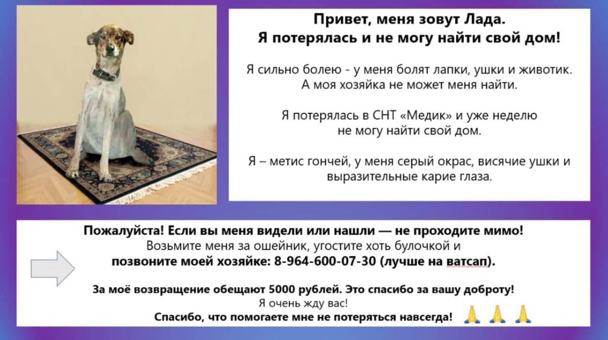 25 августа между СНТ Медик и СНТ Рассвет потерялась собака метис-гончей. Приметы: высокая, худая, висячие ушки, длинные лапы, большая узкая грудина, с правого бока видна шишка. Нашедшему вознаграждение