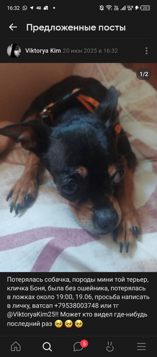 Потерялась собачка, породы мини той терьер, была без ошейника, потерялась в ложках около 19:00, 19.06, просьба написать в личку, ватсап +79538003748 или тг @ViktoryaKim25!! Может кто видел где-нибудь последний раз 🥺🥺🥺