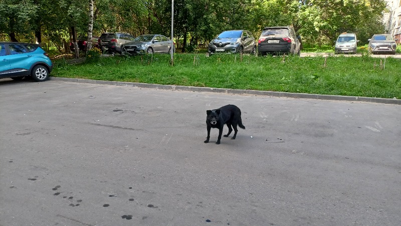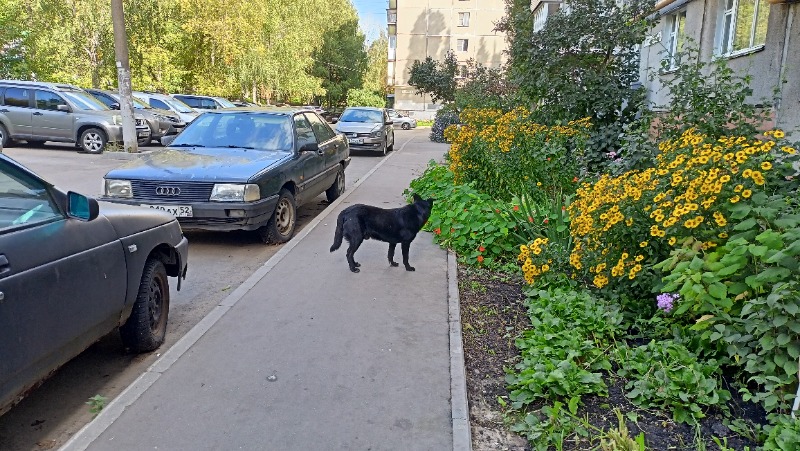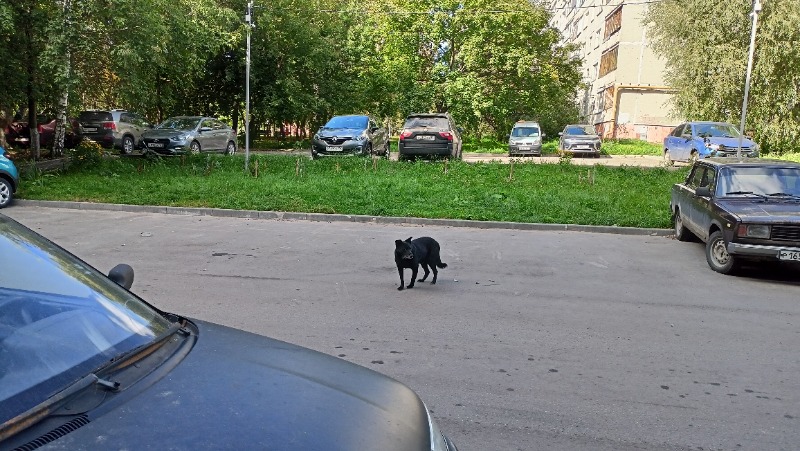 Найдена черная собака с белым размытым пятном под мордой. Средняя. Крепкая. Ухоженная. Воспитанная. Не ест. Ждёт хозяина приходит и смотрит на подъезд по многу часов. В подъезде и доме ее не видел.