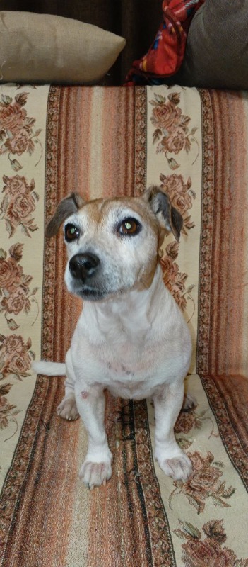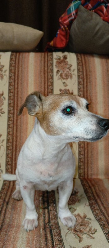 Пожилая сука Джек Рассел. Гладкошёрстная. Окрас классический бело-коричневый. Морда коричневая. На спине большое коричневое пятно. На самом конце хвостика темное пятнышко.