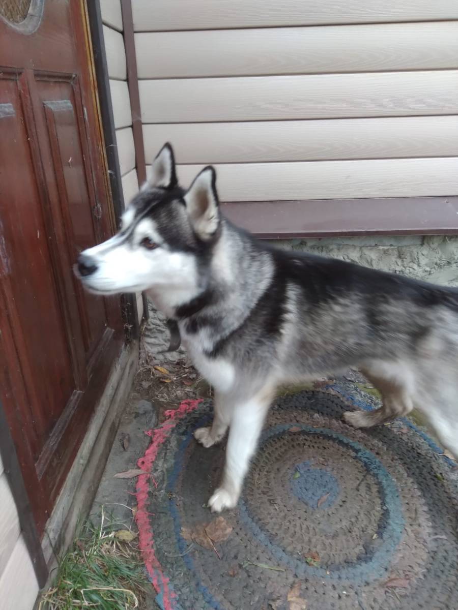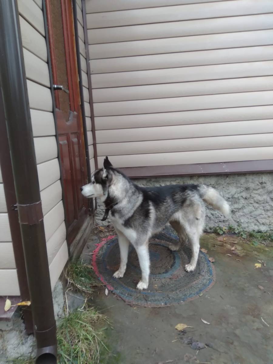На дачу пришёл кобель Хаски (или маламут). Рязанский р-н, д. Пальное. Ухоженный, с ошейником, знает команды, не боится людей. Видно, что чей-то любимец ушел на запах девочки. Глаза разные, карий и голубой.