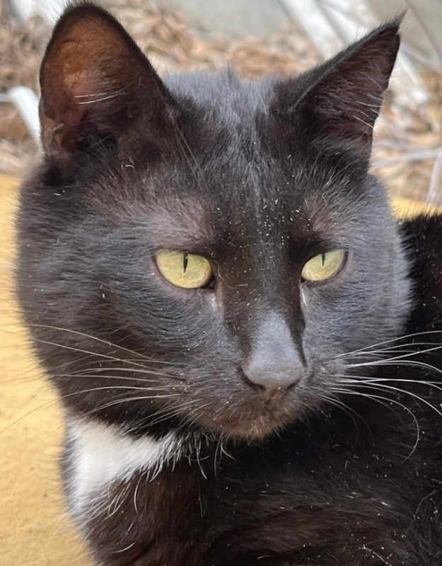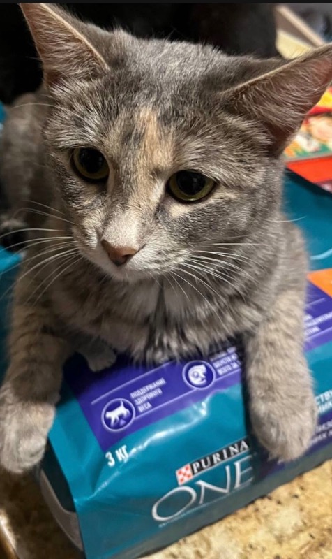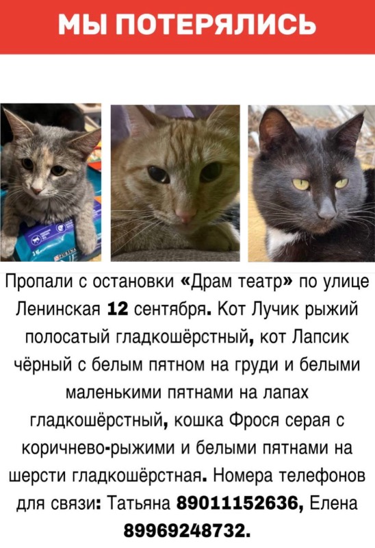 Чёрный кот с белым пятном на груди и белыми пятнышками на лапах, рыже-коричневый полосатый кот Лучик, серая с коричнево-белыми пятнами кошка Фрося. Кастрированы, стерилизована.