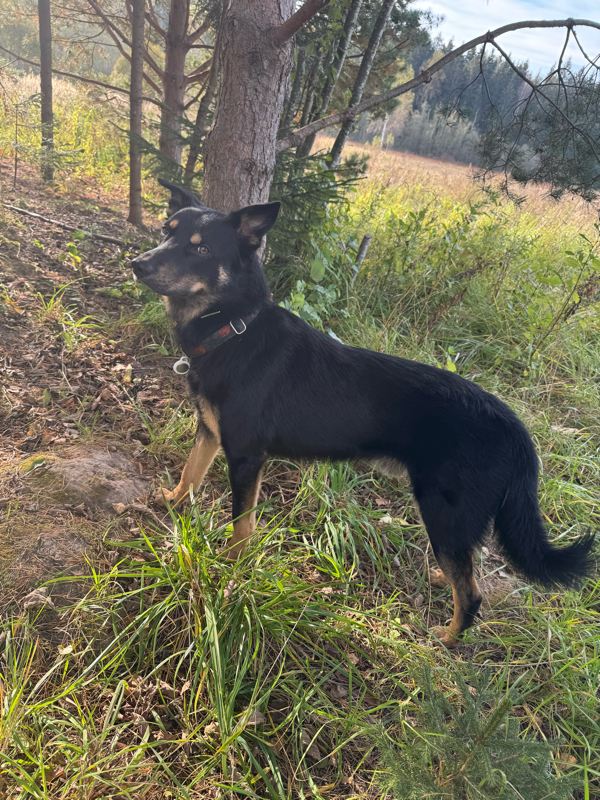 ‼️Убежал в лес молодой пёс Бруно. Среднего размера (чуть выше колена), окрас черный с рыжими лапами и бровями. Хвост баранкой. На ошейнике висит метка бело-серебристый диск.