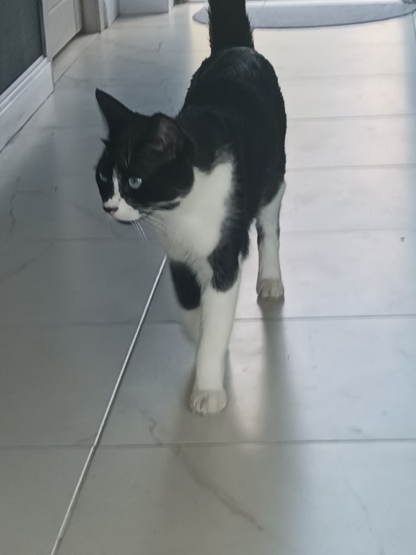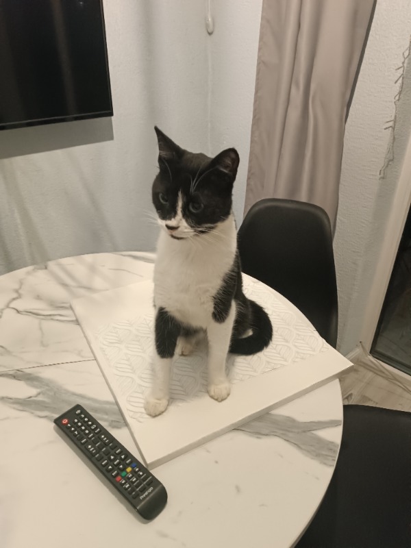 -У кота черно белый окрас и гладкая шерсть , нос черный сверху и розовый с низу .Весом примерно 5 кг телосложение подтянутое.Мяукать может немного хрипло. -Чужих людей может шугатся ,но просто так никогда не нападает .