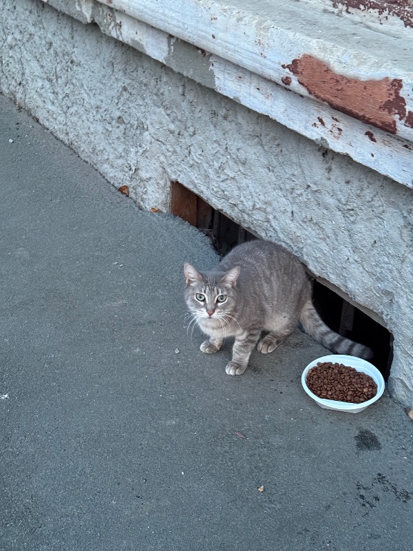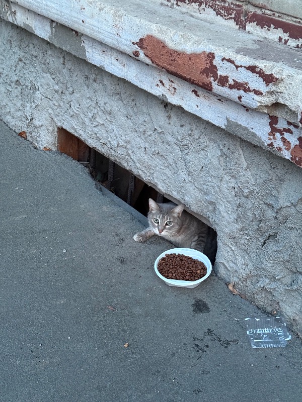 Видно, что кот/кошечка не приспособлен(а) к улице, мерзнет и ждет помощи там, где подкармливают.