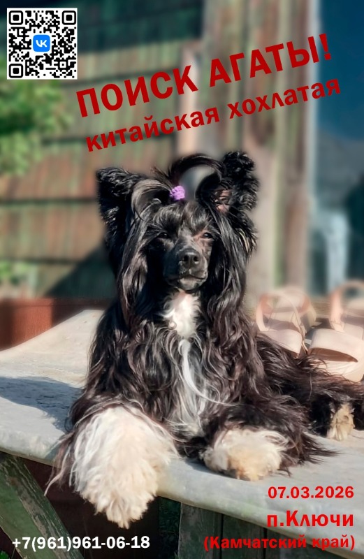 07.03.2026 в поселке Ключи (Усть-Камчатский муниципальный округ, Камчатский край), ул. Колхозная, потерялась Агата, китайская хохлатая собака пуховая с черной шерстью и белой грудью, возраст 1,5 года. Собака маленького размера, контактная. Помогите найти! Контакт 8-961-961-06-18, https://vk.com/poiskagata_kamchatka