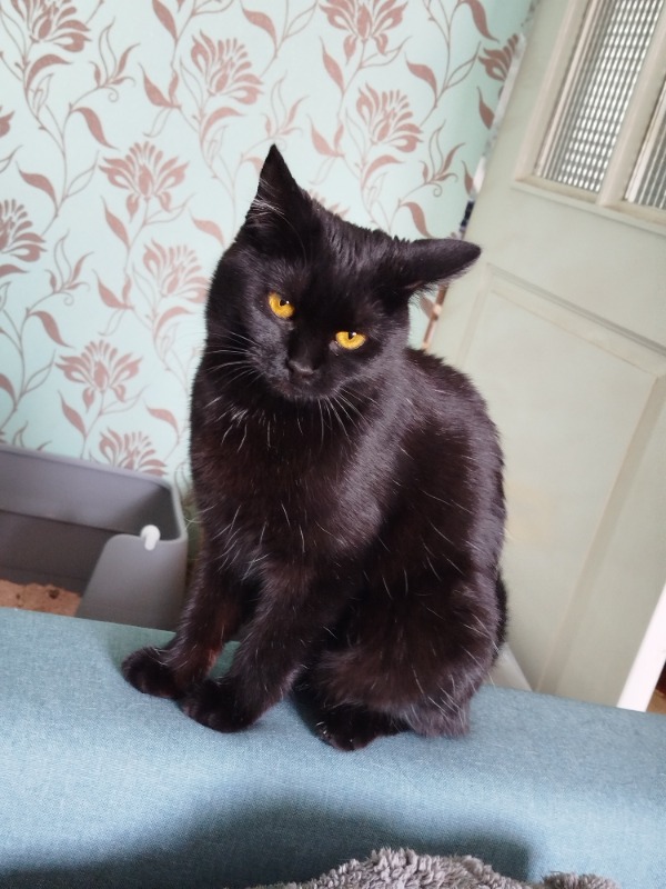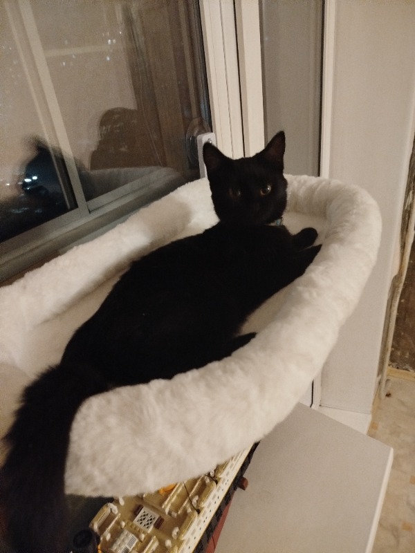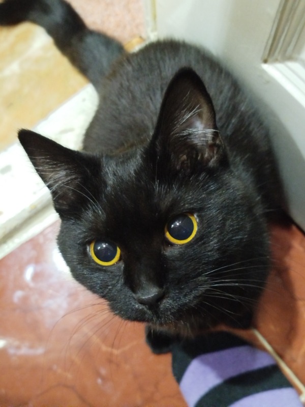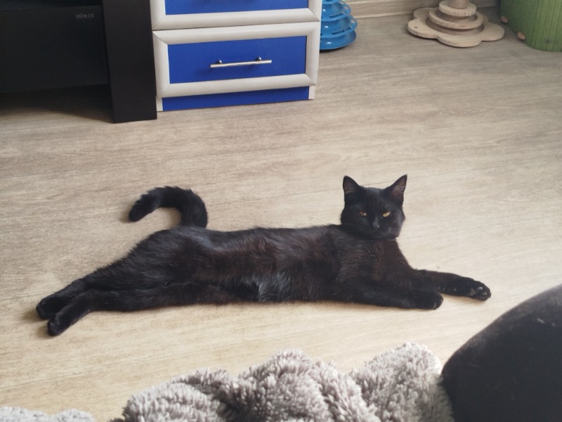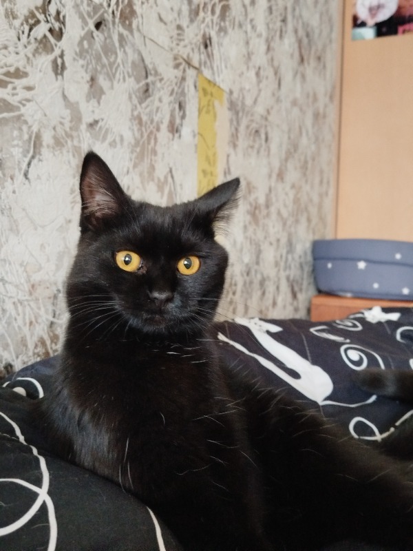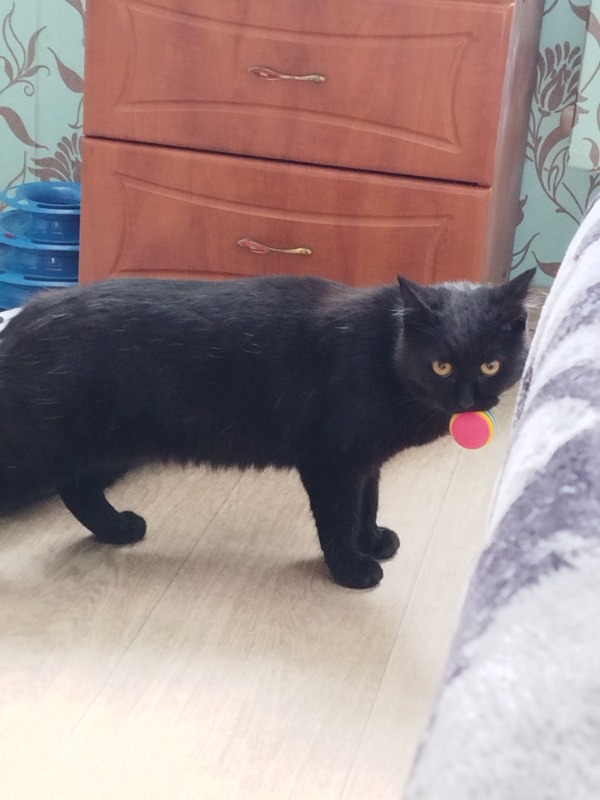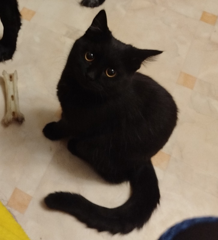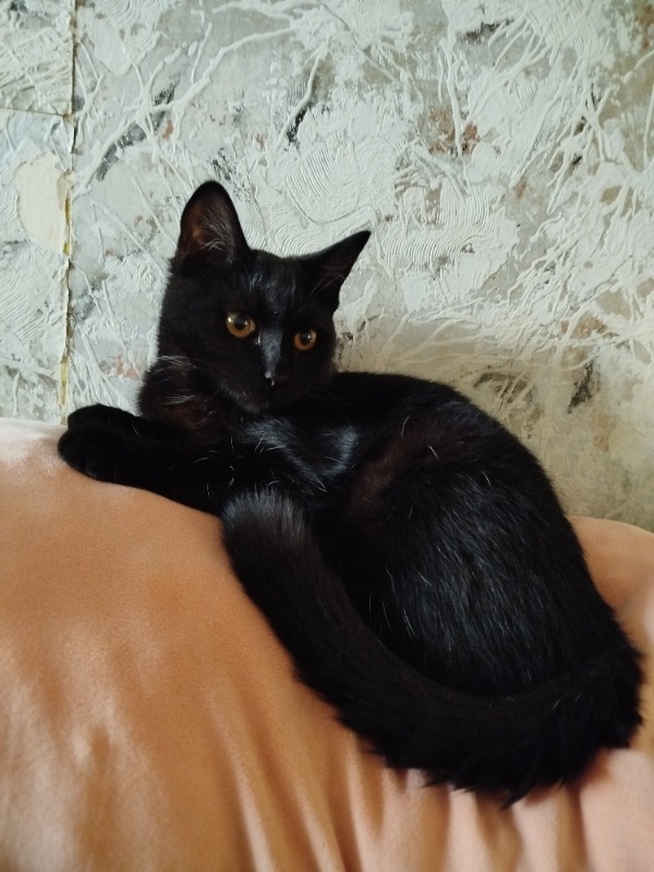 Черная кошка, короткошёрстная, небольшая, худенькая. Особые приметы: белые длинные шерстинки по всему телу