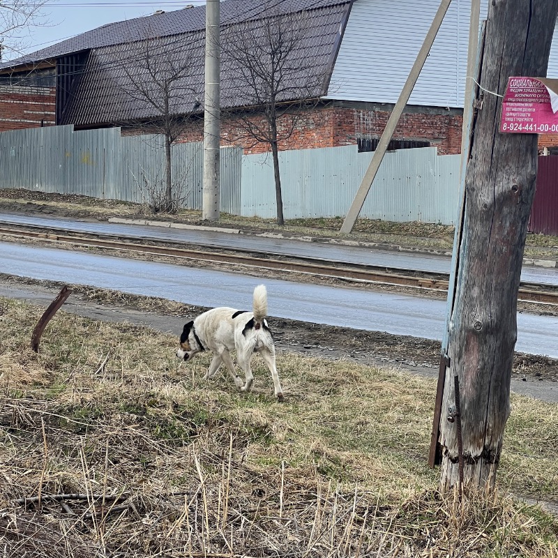 СОБАКА БЕГАЕТ ПО УЛИЦАМ КИРОВСКОГО РАЙОНА! 23.04 была замечена на ул. Джамбула — фото оттуда (точное место указано на карте), 24.04 бежала от ТЦ Счастье к Амурскому бульвару. Белая с черными пятнами, морда с черными и коричневыми пятнами. Выглядит потеряно, нюхает все время и озирается по сторонам. На шее черный ошейник. Пол не разглядела. Фото только издалека, т. к. пробежала мимо быстро.